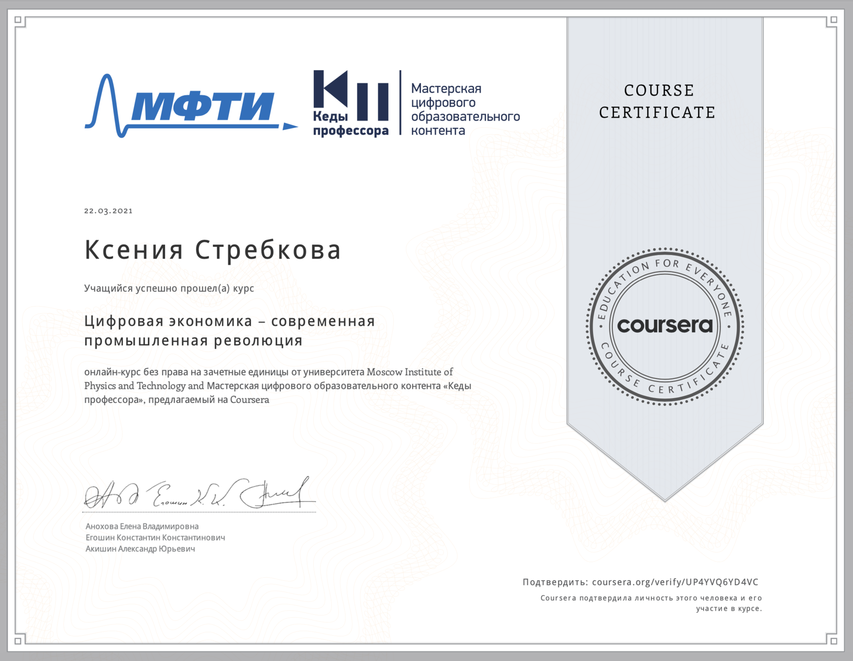 По итогам прохождения курса будет выдан электронный сертификат*, ссылками на который можно делиться с другими людьми.